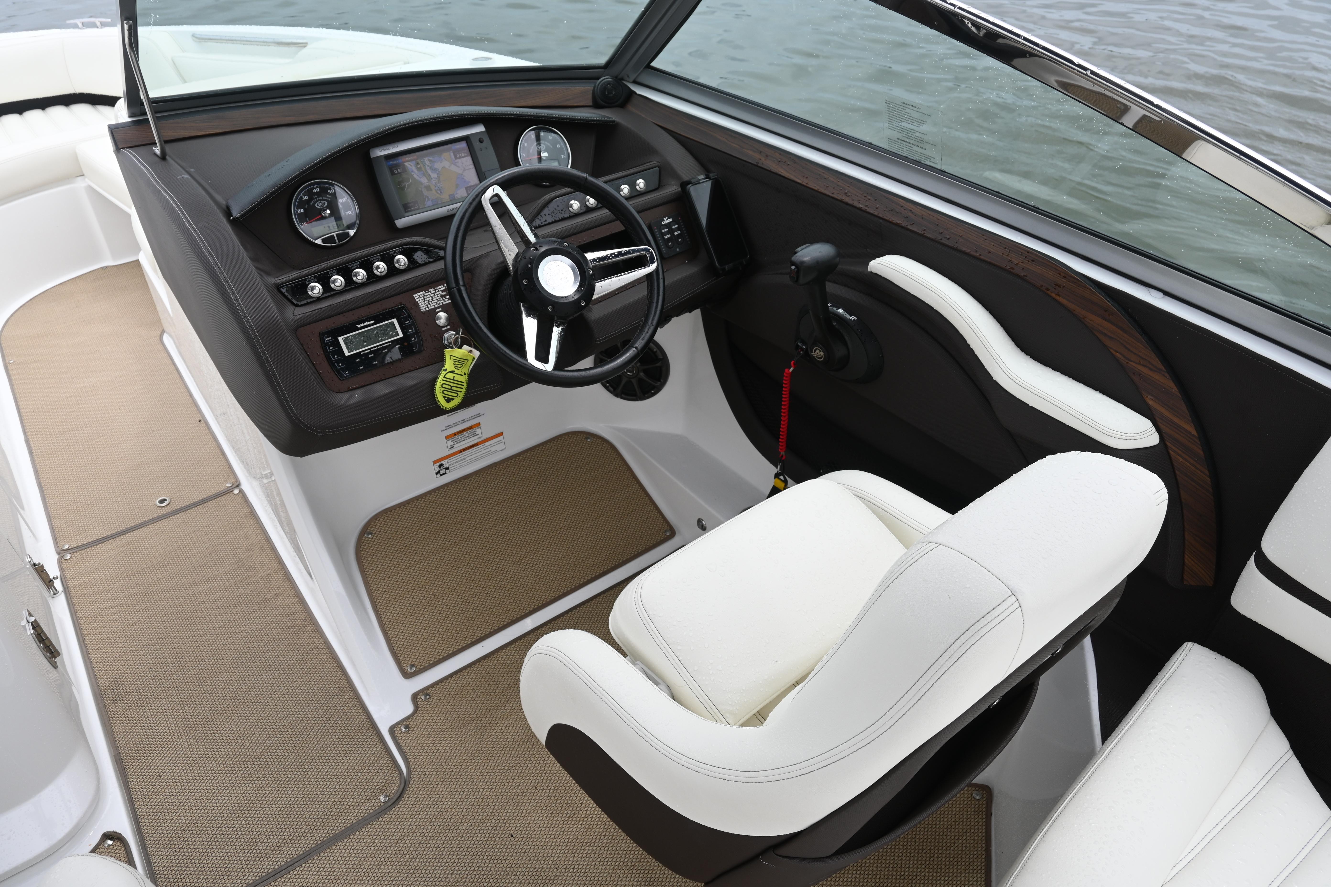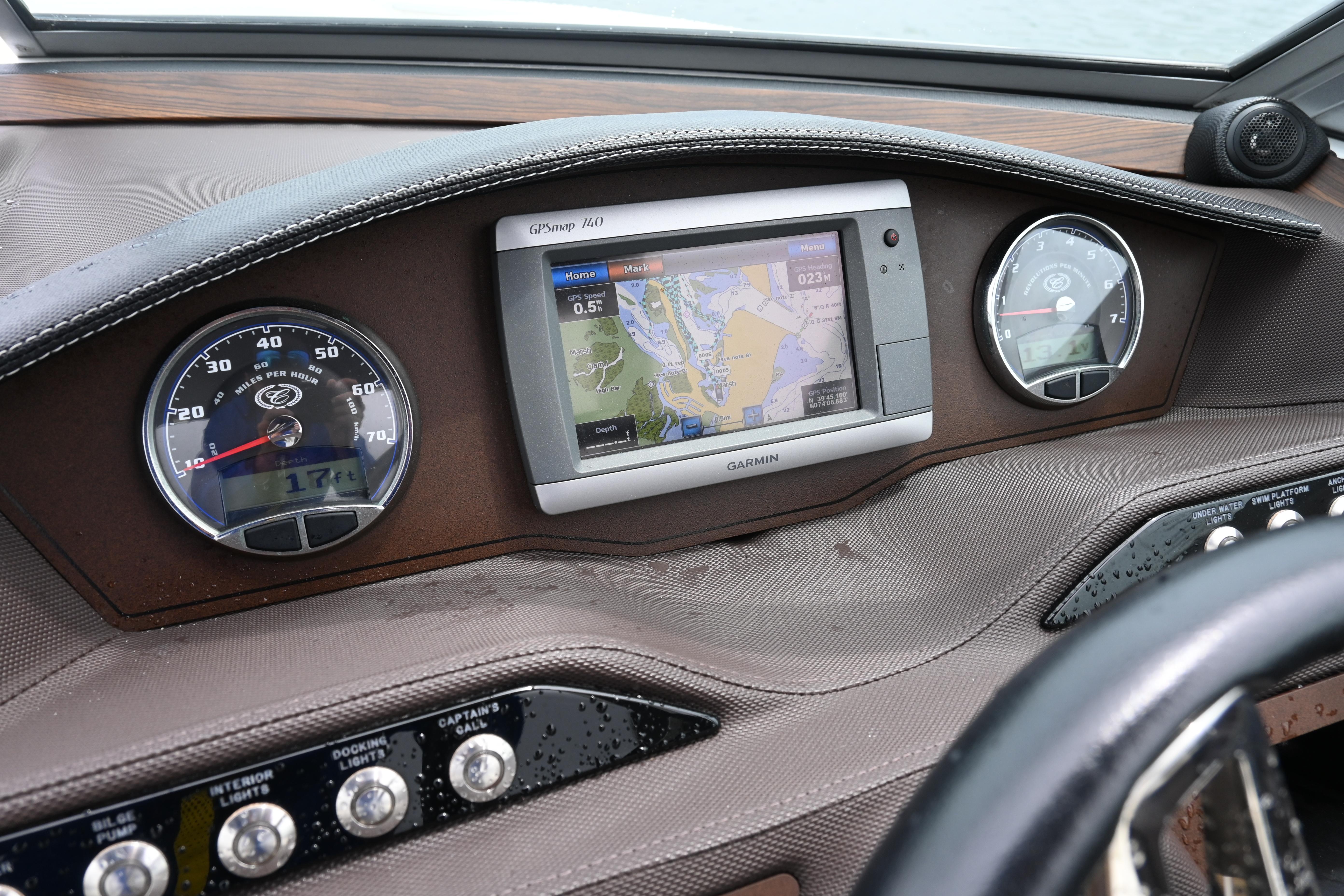 The helm gleams in hand-craftsmanship, in oil-rubbed ebony Makassar trim and duotone aluminum dash panels and switches of stainless steel and five-inch digital gauges with multi-function readouts and, over all, a form-fitted eyebrow in everlasting vinyl. The wheel wraps in leather: one of the most time-honored of Cobalt traditions, this masterpiece of a steering wheel. Our owners have always insisted on comfort and convenience and accessibility -- "ergonomics" to our designers -- and so the R5's armrests and footrests and controls and cupholders and every last little amenity aboard arrives with a form and a function just too ergo for words. And one more name to drop: the Rockford Fosgate stereo, optimized and ready, as we say, to crank.
