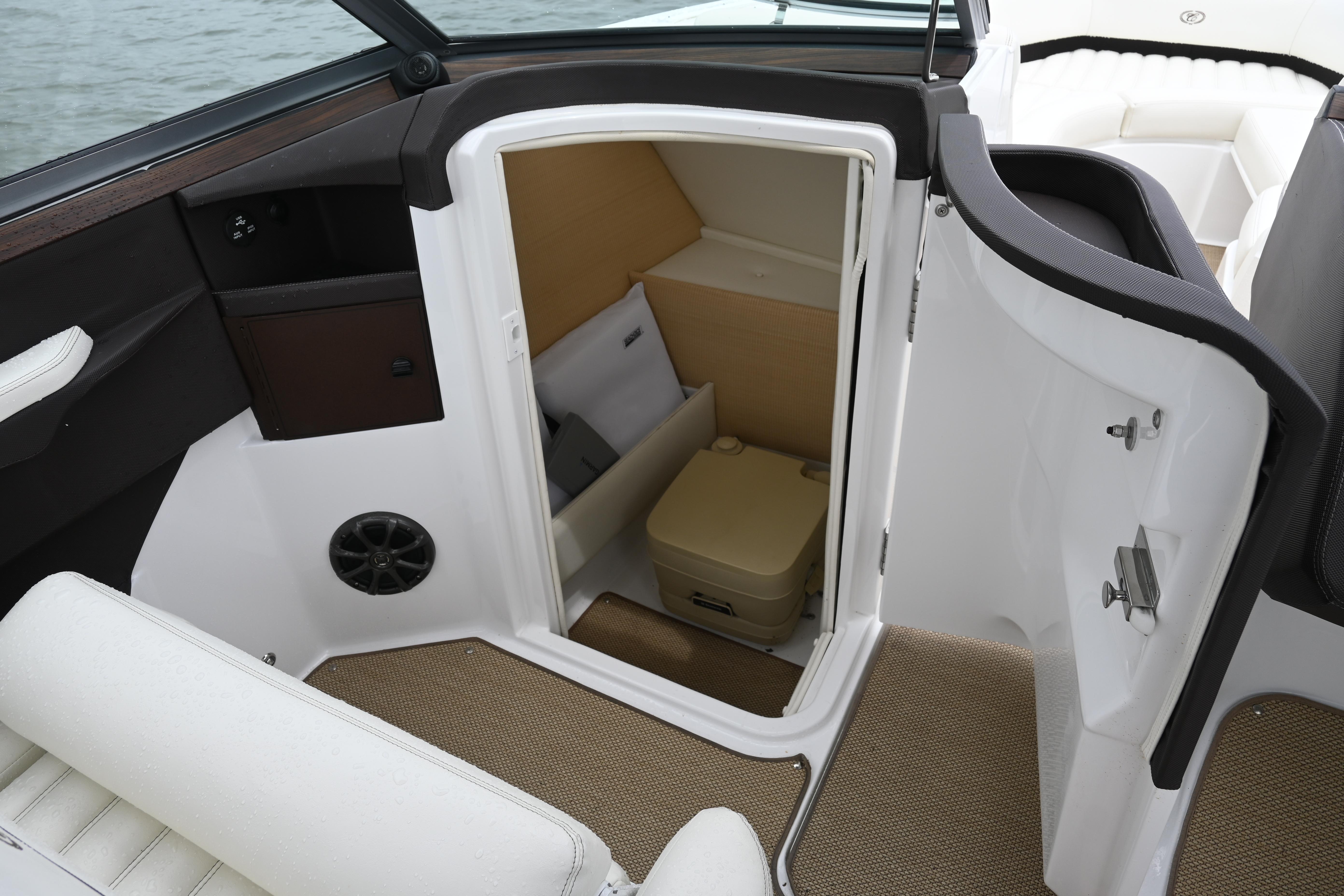Asked to create a mid-sized runabout with traditional elegance and the smoothest of quiet rides, we went to the prototype shop with an exterior profile first in mind. Sleek, low, and aggressive. Very, very aggressive, per the R5's Edge graphics, set forward of the sculpted truth that is the R5's transom, swim platform, and sunpad -- cohesive in their integrated design, free-flowing in their easy functionality. The transom is walk-thru, of course. The back-rest is convertible, and the space forward is wide and wider still, with an interior beam almost a foot wider than the ever so super-spacious 242's. We then followed with yachtesque, wraparound seating to capitalize on those wishes for a flawless ride, a ride begun of course in that legendary Cobalt hull. This seating configuration, by the way, belongs only to Cobalt in boats of the R5's size. The twice wide passenger seat forward makes the cockpit even more flexible in its service of a good time -- fully convertible in direct reflection of seating aft. A console door, elegant in its woodgrains and crafted vinyls, opens to a head larger above and all-around than any other boat in the class.
