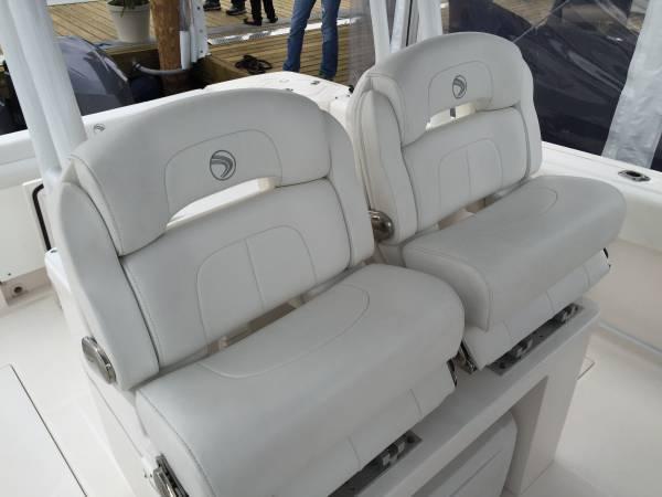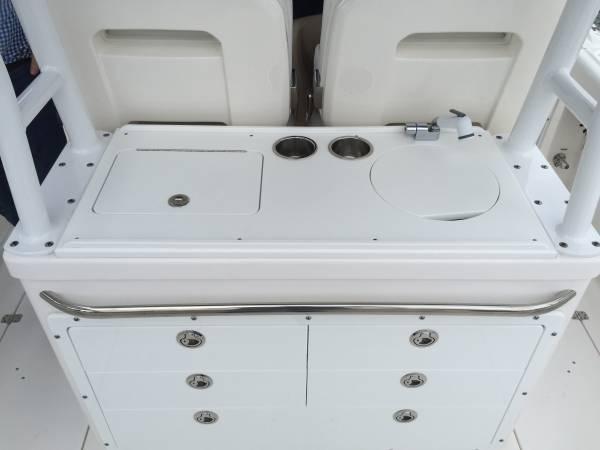 comes with a sink, cutting board, storage drawers, rod holders, flip-up helm seats, and optional