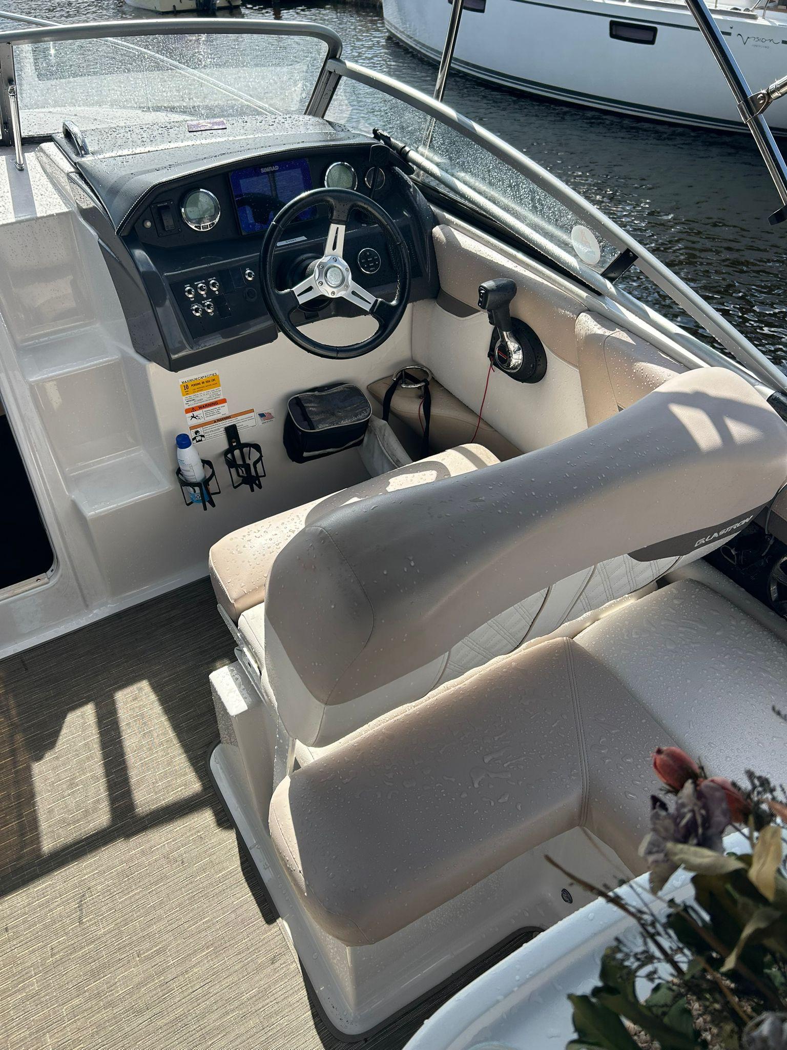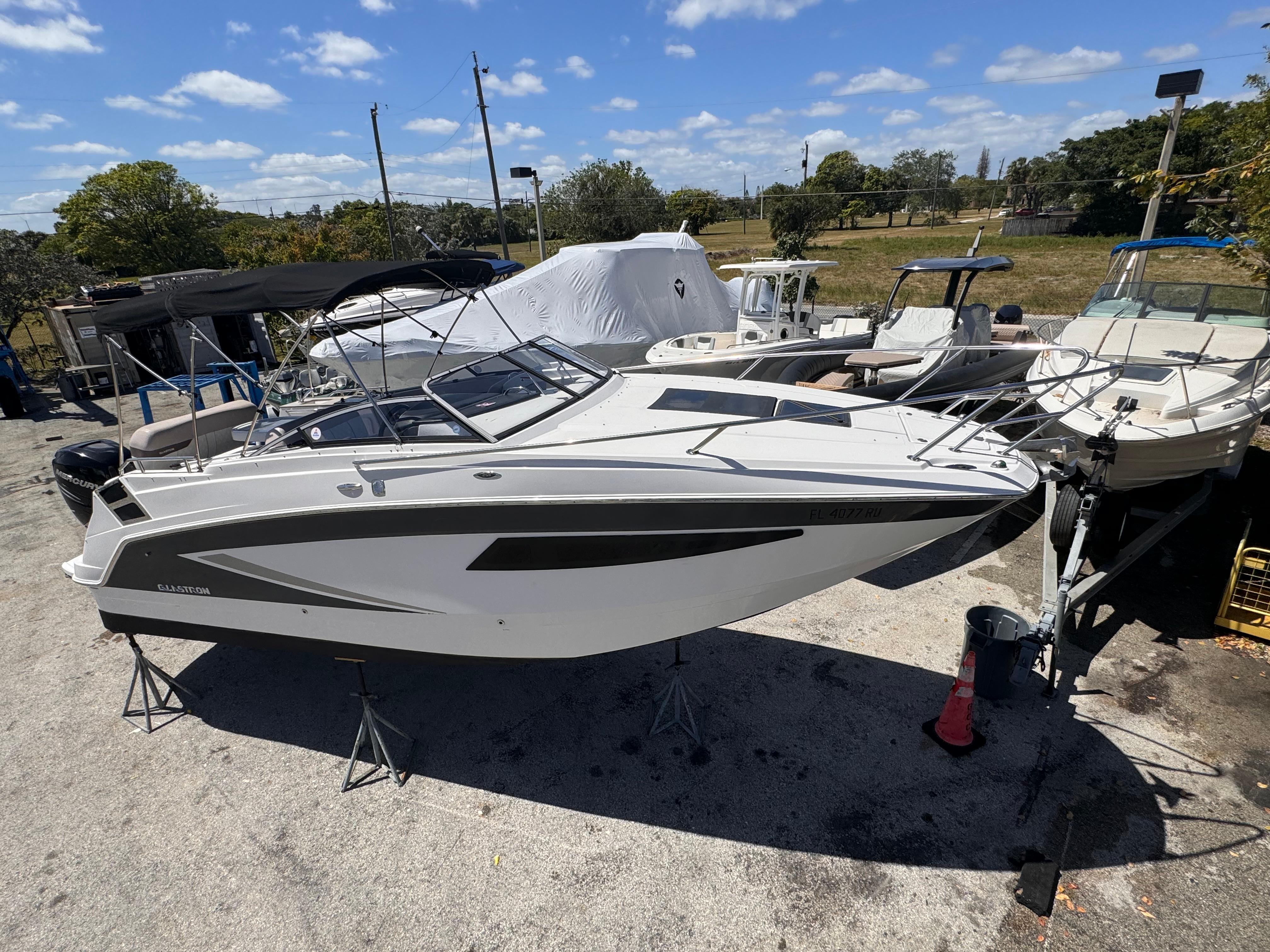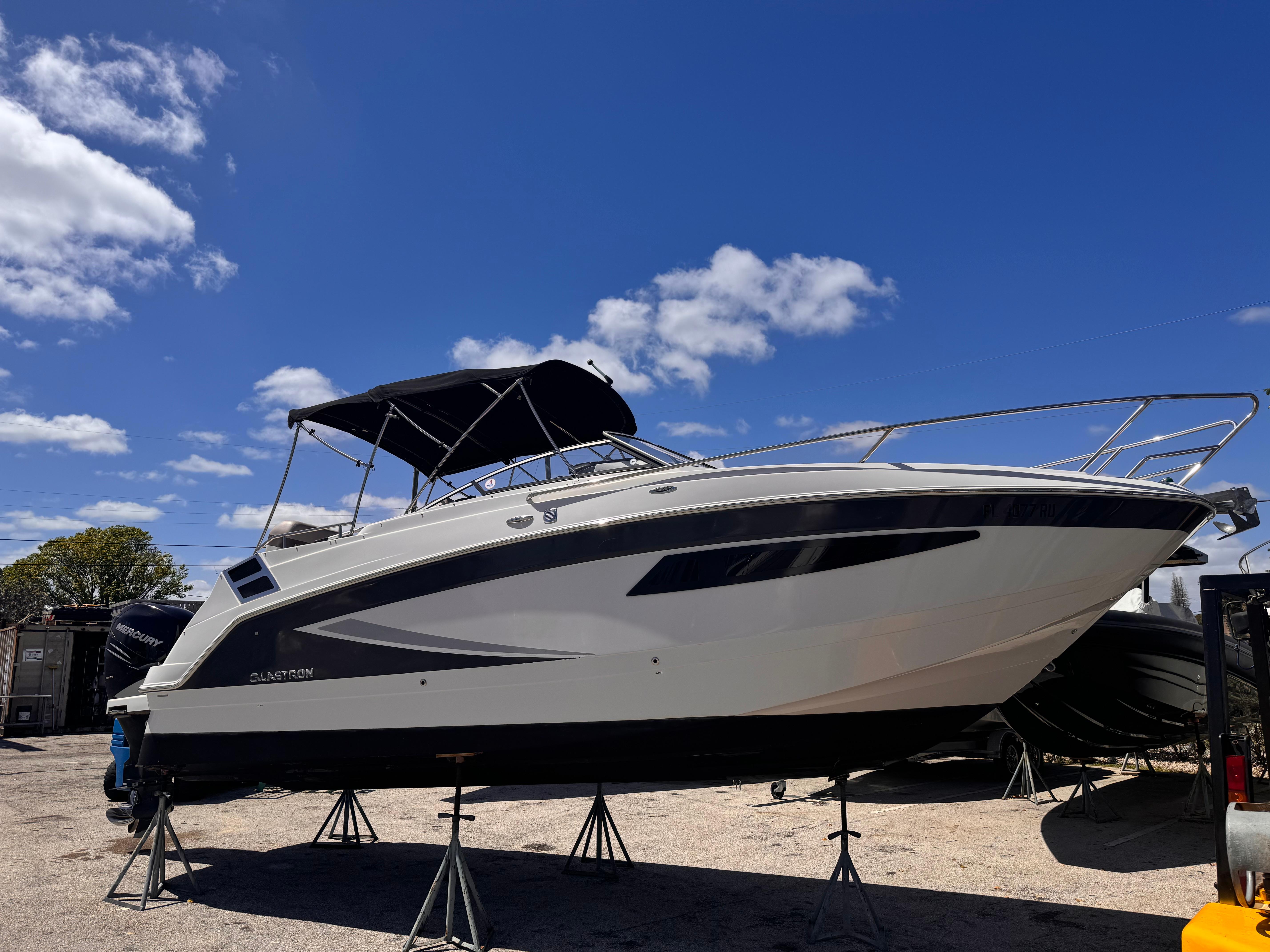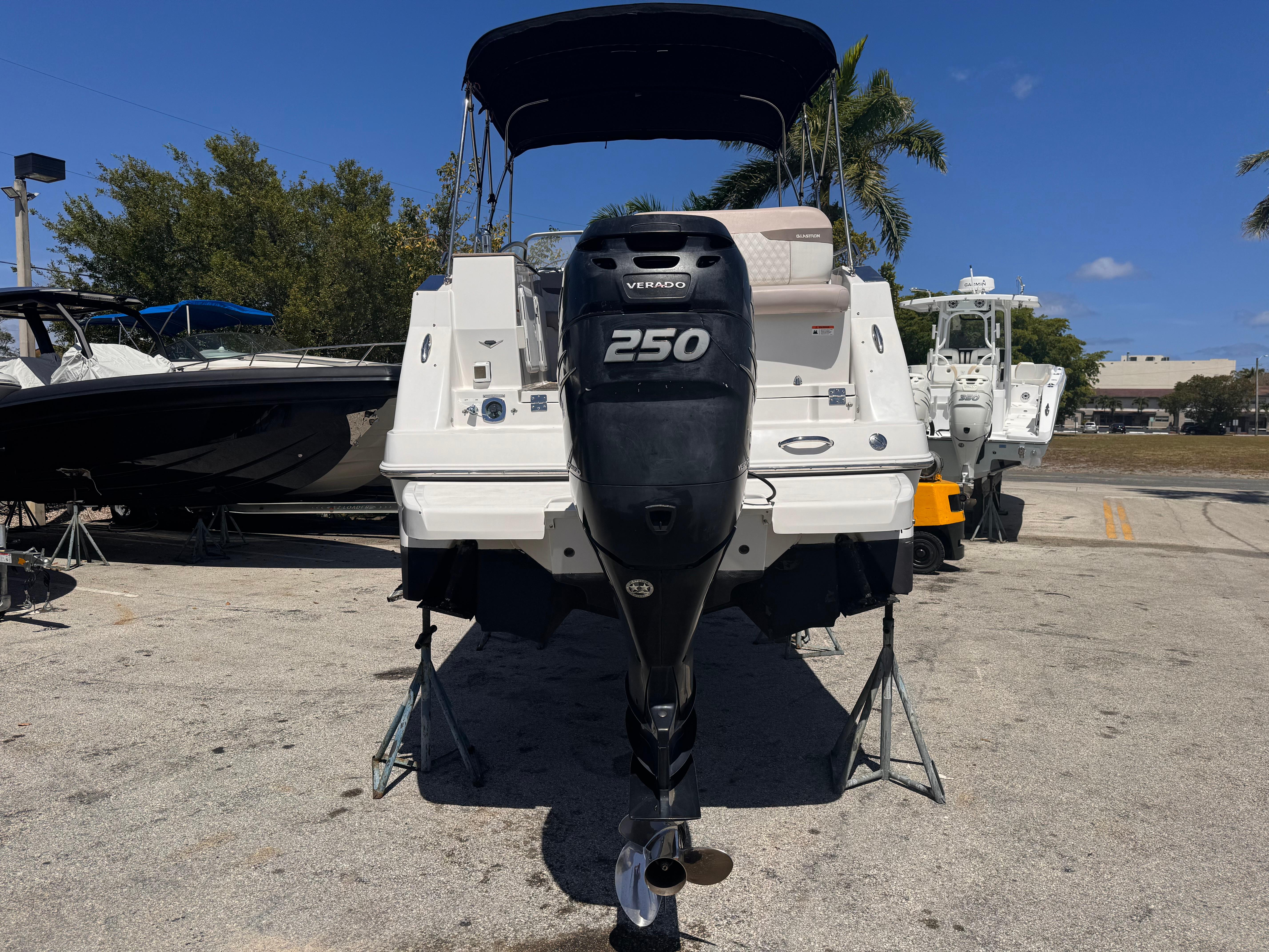 The 2019 Glastron GS 259 is a sleek and powerful boat featuring a Mercury Verado 250 HP Sterndrive outboard engine for smooth performance. Equipped with modern technology like the Mercury Smartcraft system and Simrad GPS touch screen, it offers advanced navigation capabilities. Comfort is paramount with amenities such as a Webasto air conditioning system, microwave, refrigerator, and electric stove. With accommodations for 2 sleepers, a head pump, and a range of conveniences like a Kicker stereo system with Bluetooth, Lenco Trim Tabs, and a Bimini top, this boat ensures a luxurious and enjoyable experience on the water.